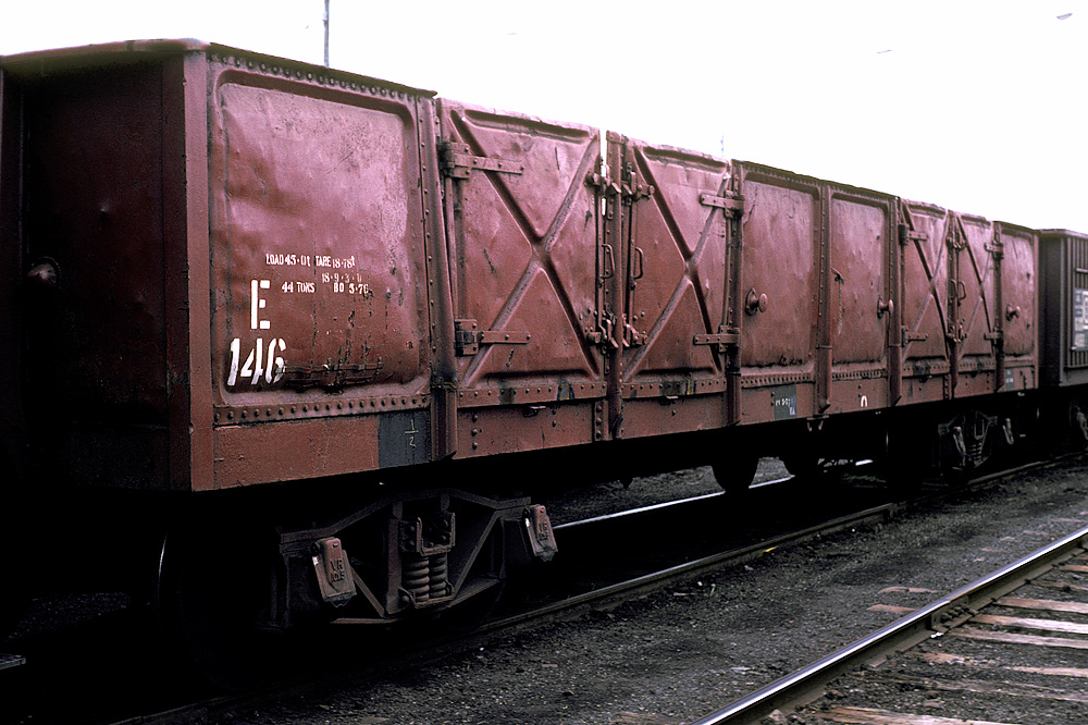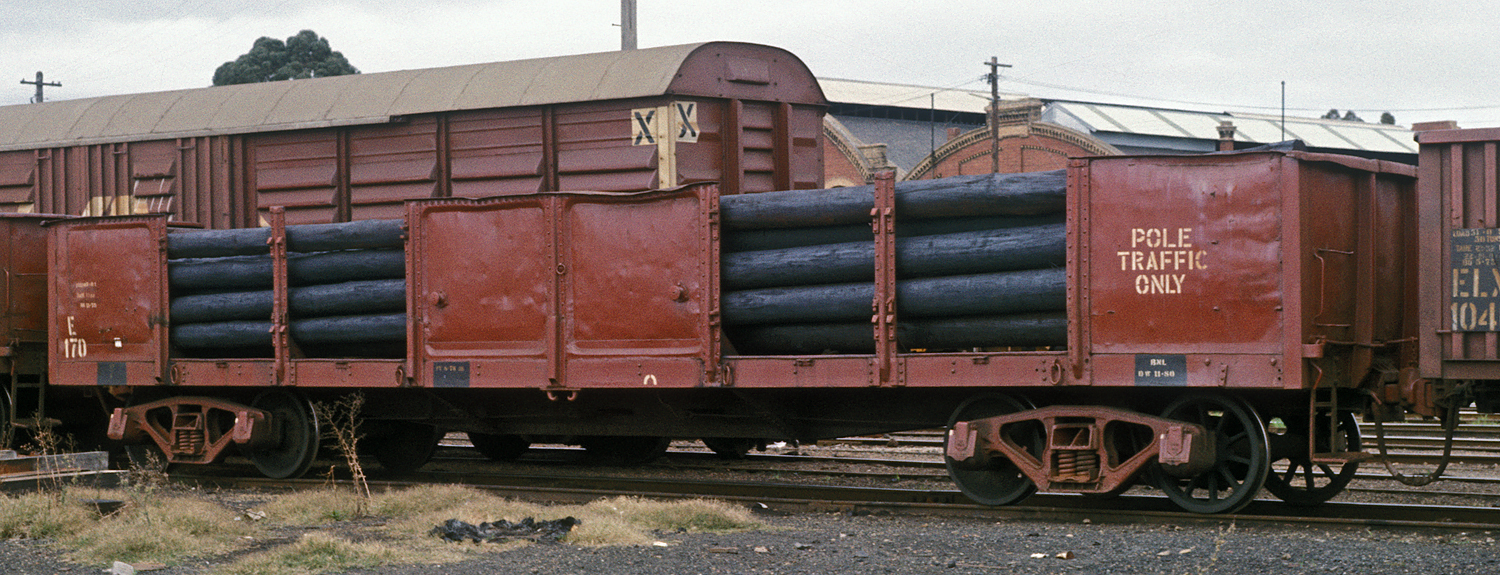In 1925 the VR purchased two open wagons in kit form from the American Car & Foundry company and assembled them at Newport into E 1 and E 2. Newport then built 200 more nearly identical copies. Over the years a lot happened to this class. During World War II 99 E's had their bodies removed and were used as flat wagons (classed S) After the war, 1947 - 1949, 72 had new sides and ends fitted of the HY design E 123 and E 89. 100 E's were converted to S flat wagons in 1941 for wartime traffic, Some E's were converted for pole traffic in later years as shown in the photo of E 170, yet other E's donated their underframes to become tank wagons. At the end of their lives a few made it into departmental traffic as HR's. | |||||||||||||||||||