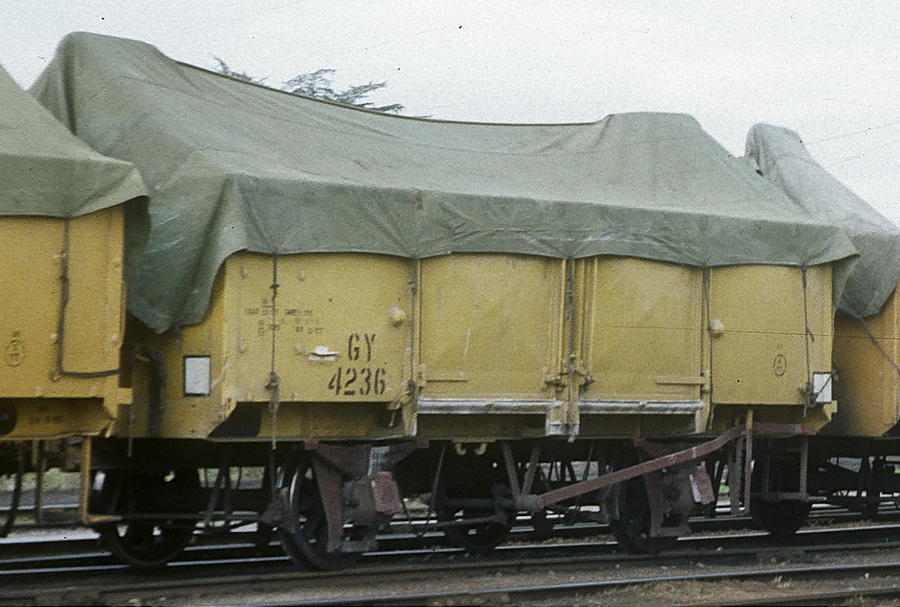 ABOVE: Although GY's were mainly a wheat carrying wagon, in the off season they were often loaded with all sorts of things. GY 16338 loaded with 2 cabs from scrapped W class locos, Tottenham yard 1980