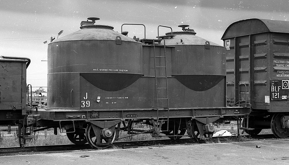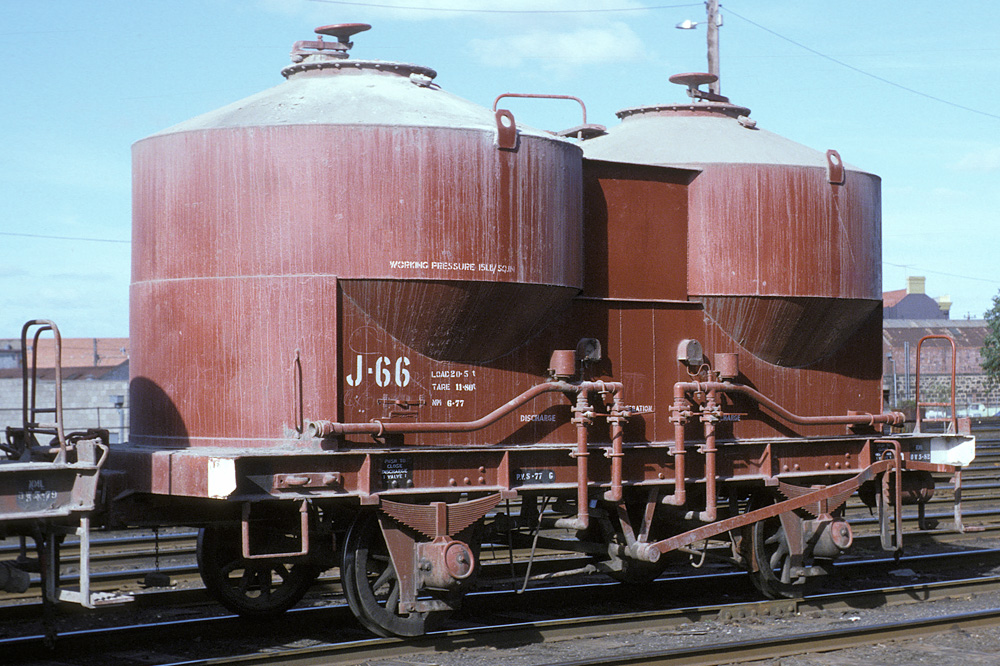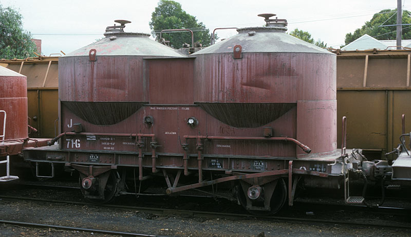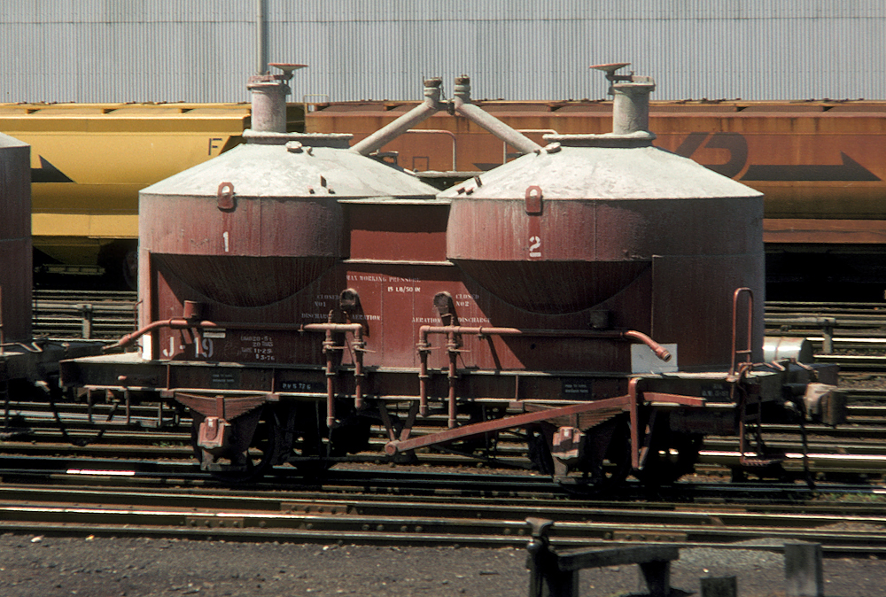 The J's have a rather complicated history which I have summarised in the table below. 1 - 7 trace their roots to carrying pulverside brown coal for steam locos. When this traffic ended they went into flour traffic as X, FX and FJ. Later deliveries were built as X's for cement traffic. X was not a good code to use because after the SG reached Melbourne the letter X at the end of a code signified a wagon that could be bogie exchanged thus the recode to "J"