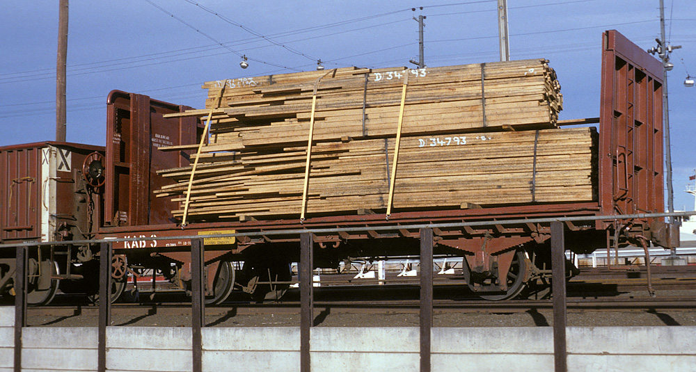 These wagons had a fixed bulkhead at the non handbrake end and an adjustable bulkhead at the handbrake end, very similar to the bogie SBX class. The wagon was loaded and the bulkhead was then moved up against the load and secured. Traffic was for pineboard from the Eastern district to Melbourne.