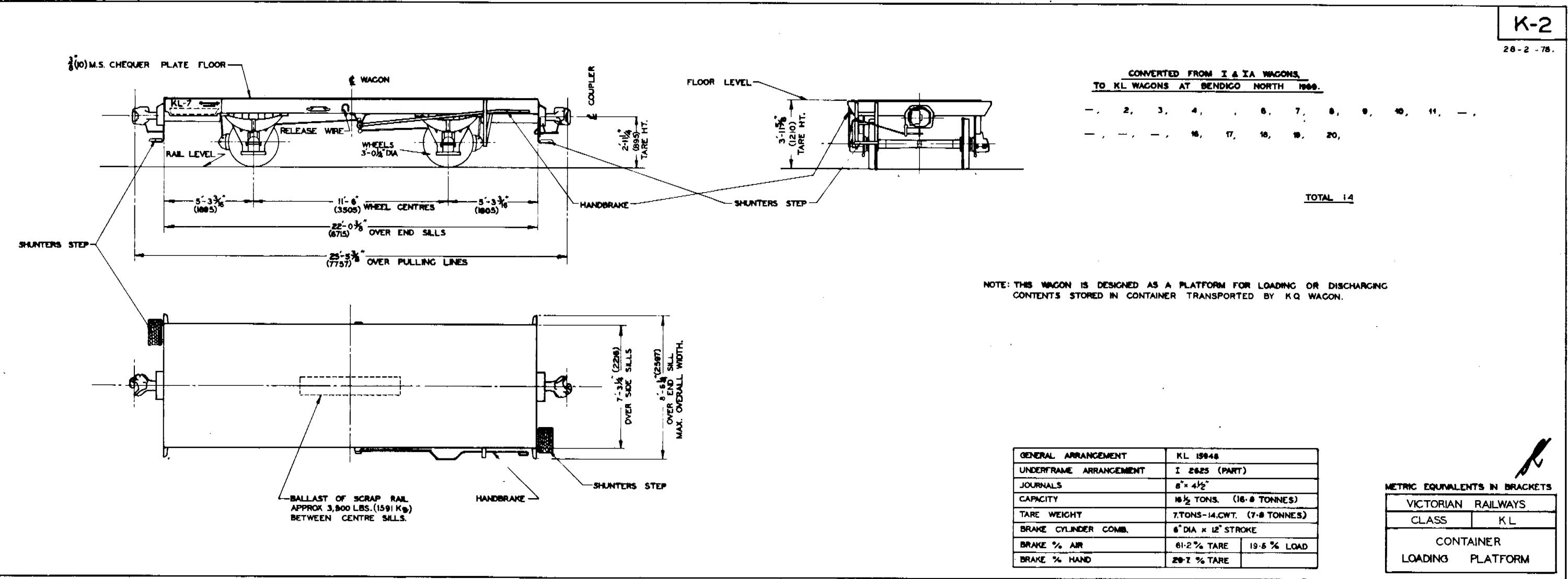 Most container use involves unloading the container from the wagon before unloading the contents of the container. In the early days of container use on the VR most locations were not equipped to physically take the container off the wagon so the container had to be unloaded as it sat on the wagon. With the introduction of KQ's it was impossible to load/unload the container as it sat on the KQ so the KL's were designed to be coupled to a KQ destined for a loaction without unloading facilities. Exactly how the KL assisted in unloading is unknown. A forklift could be used but that would require some sort of plate/ramp to bridge the gap between the KL and KQ and no evidence exists of such a ramp. Maybe the container was hand unloaded, perhaps with a road truck backed onto the KL.The only KL's I saw from 1977 on were in storage so I presume revenue use ceased before 1977. | |||||||||||||