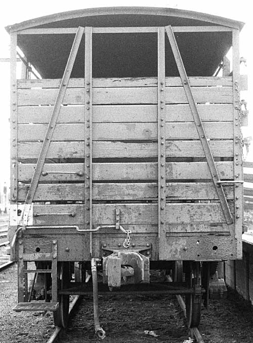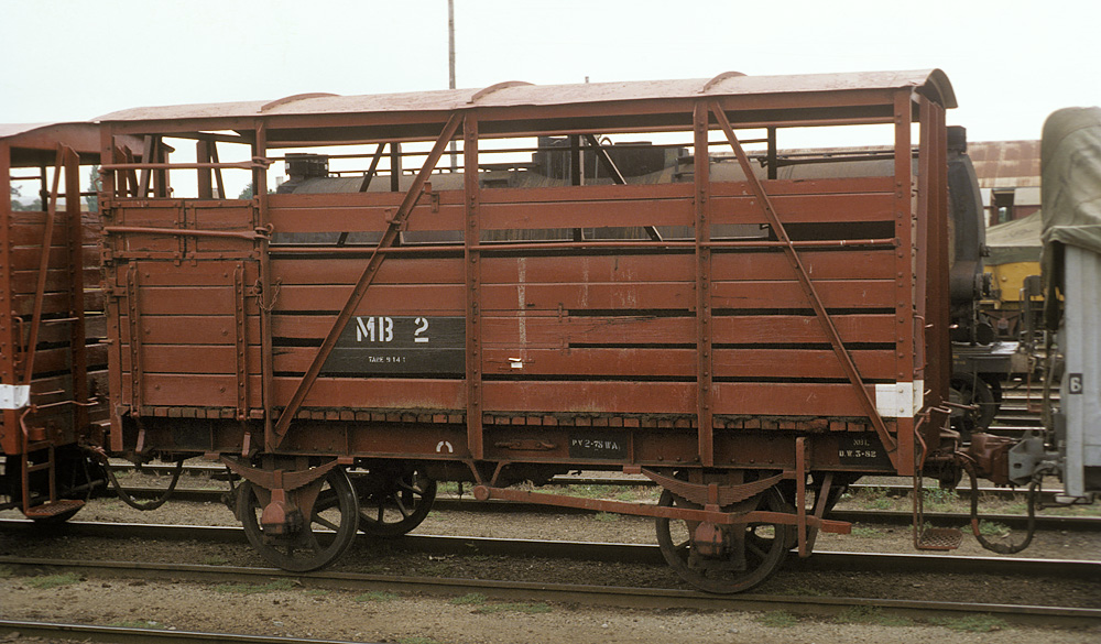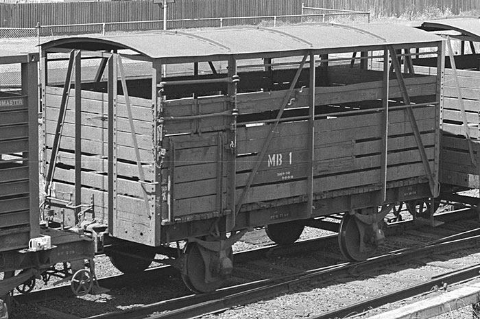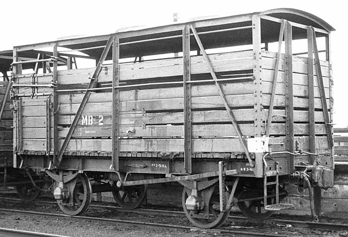 These two wagons were converted from regular M cattle wagons for the transport of bulls. A plank was removed and replaced by a lashing rail to which the bulls were tied up to. By the late 70's they seemed to be in regular cattle transport, the one time I saw one loaded it was loaded just like a regular M. | ||||||||||||||||
