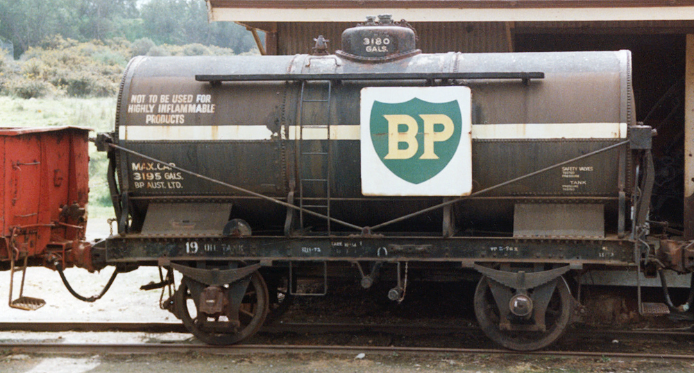 ABOVE: Oil Tank 8 built at Newport workshops May 1919, photo date circa 1919. For most of its life this wagon was employed delivering transformer oil to suburban sub-stations. The photo BELOW shows the same wagon 60 years later after having been retired from service and awaiting preservation at Newport workshops.