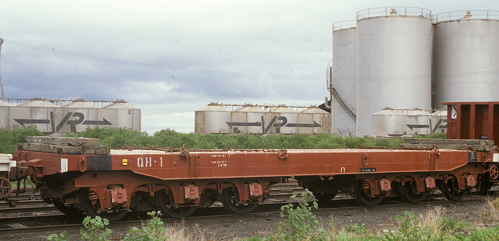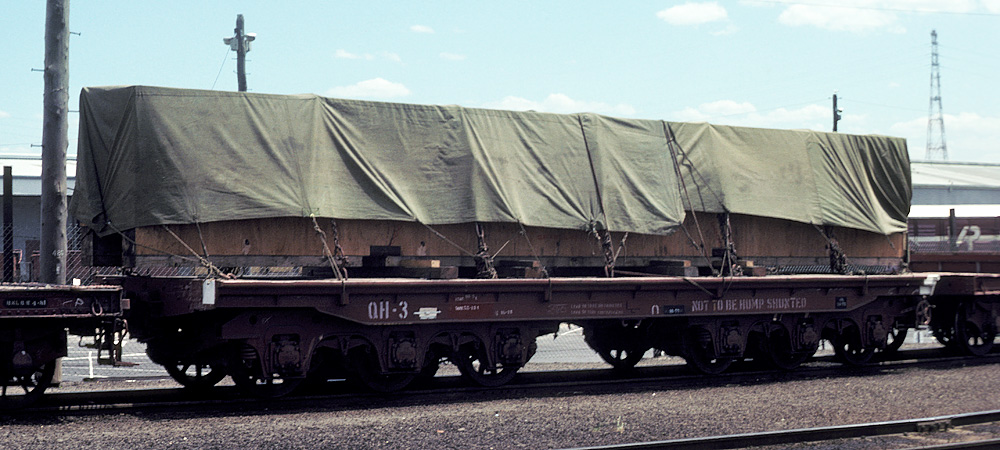 The last revenue traffic that the QH's were used in that I know of was road girders from Jewell on the Upfield line. Note the "safety wagons" either side to protect against the overhang. Photo date 1979.