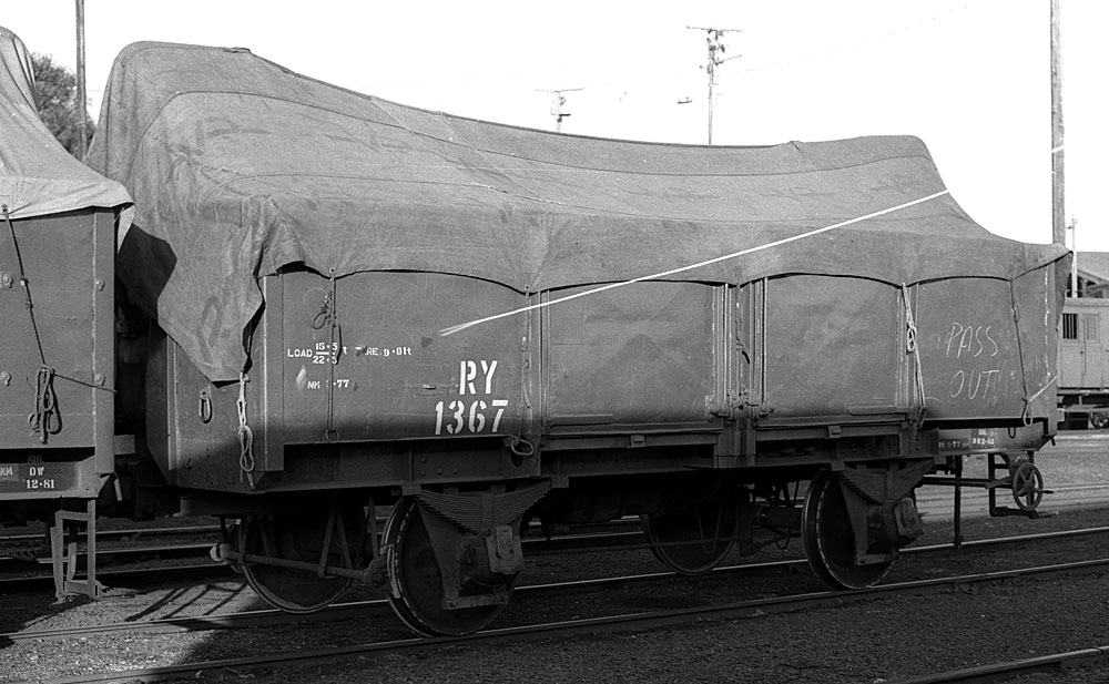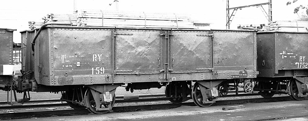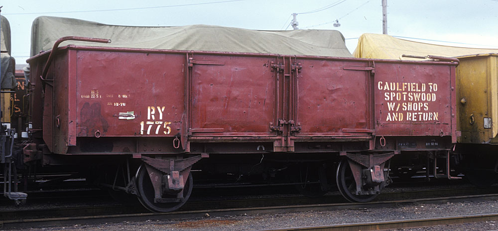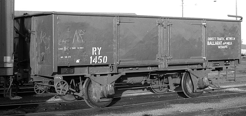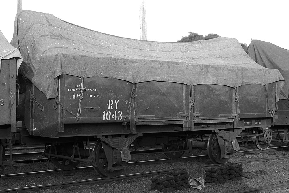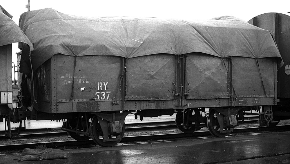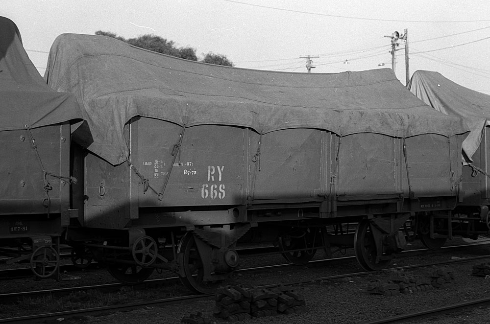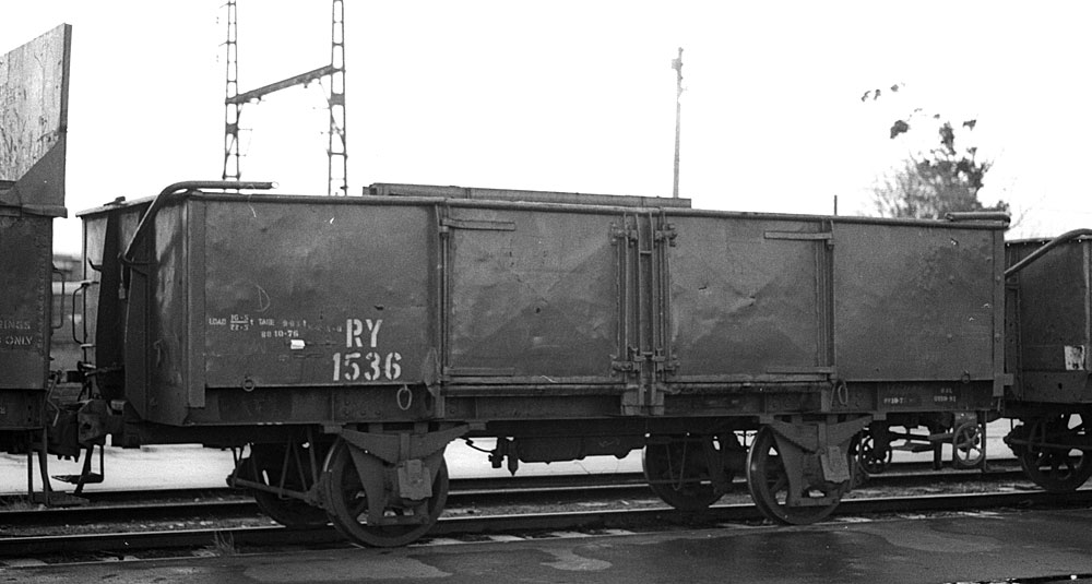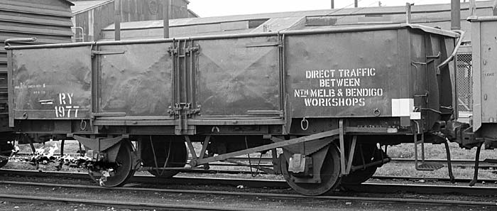 RY 1977: Built as GZ 1977 at Bendigo in 1939, recoded to IZ 197 circa 1956, recoded to RY 1977 in 1965, scrapped 1980. Photo at Nth Melbourne workshops 1978. Quite a few RY's were stencilled for dedicated traffic. I don't know why the stencilled RY's were not recoded to HD like most wagons in departmental service.