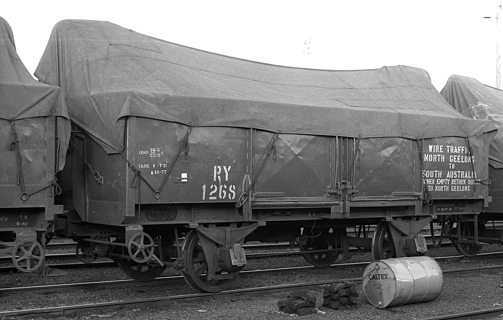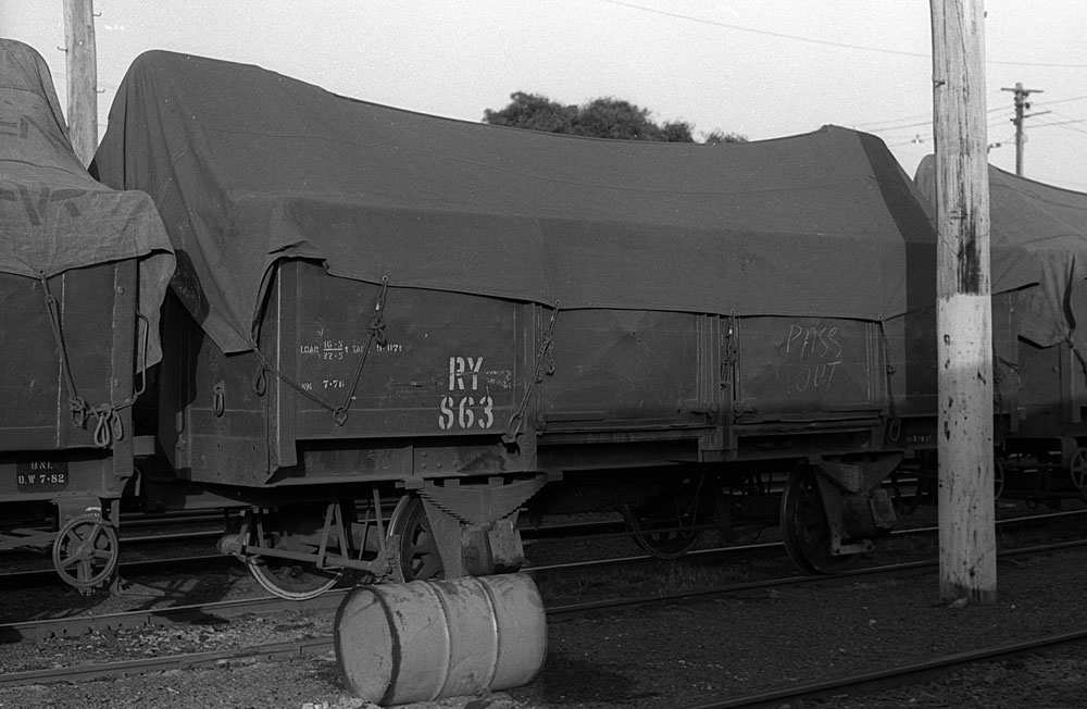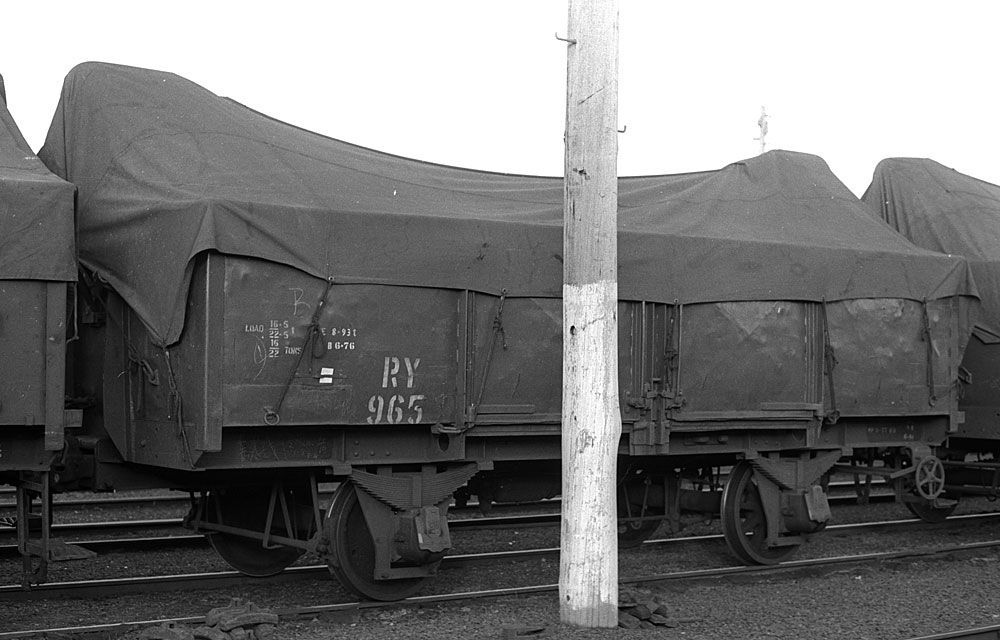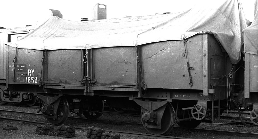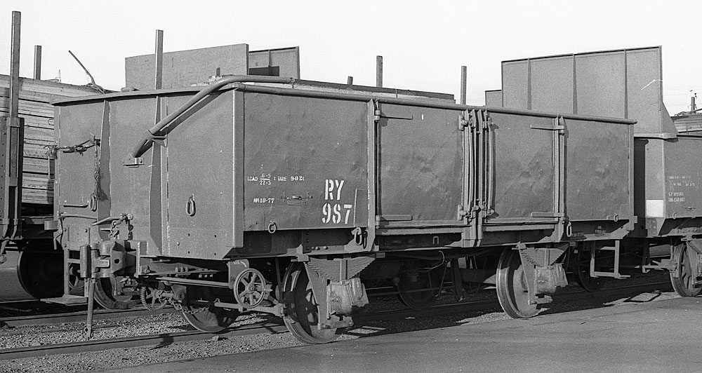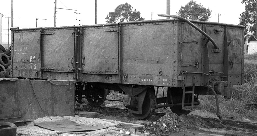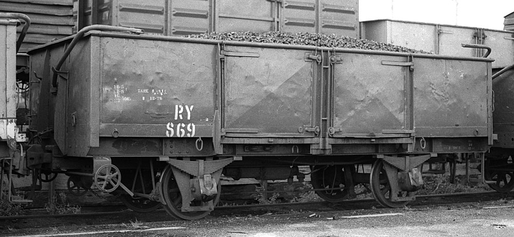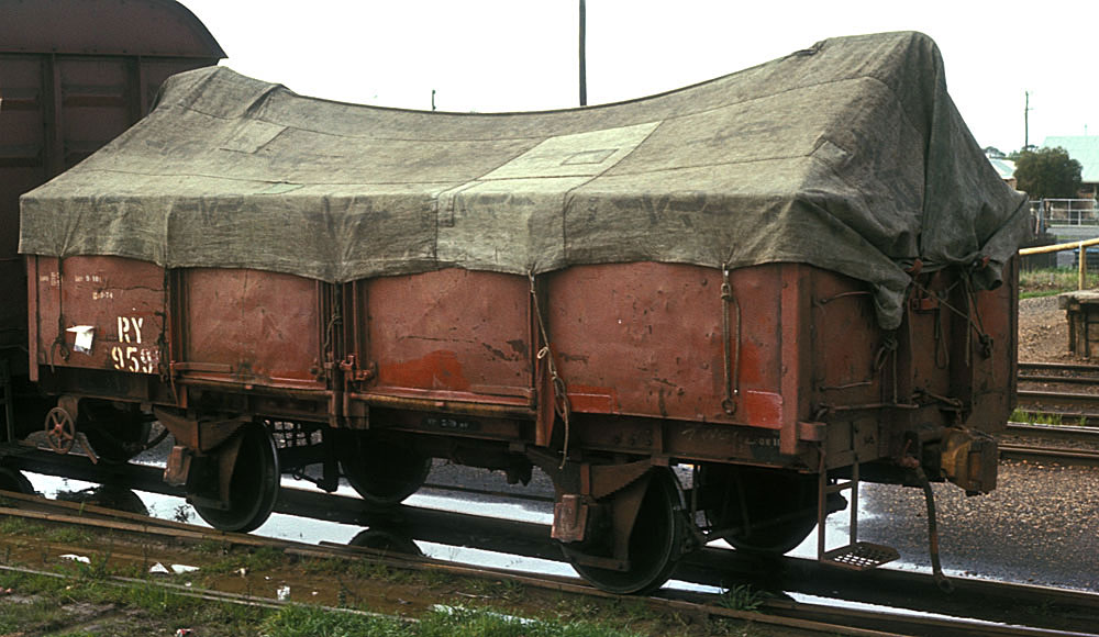 RY 1977: Built as GZ 1977 at Bendigo in 1939, recoded to IZ 197 circa 1956, recoded to RY 1977 in 1965, scrapped 1980. Photo at Nth Melbourne workshops 1978. Quite a few RY's were stencilled for dedicated traffic. I don't know why the stencilled RY's were not recoded to HD like most wagons in departmental service.