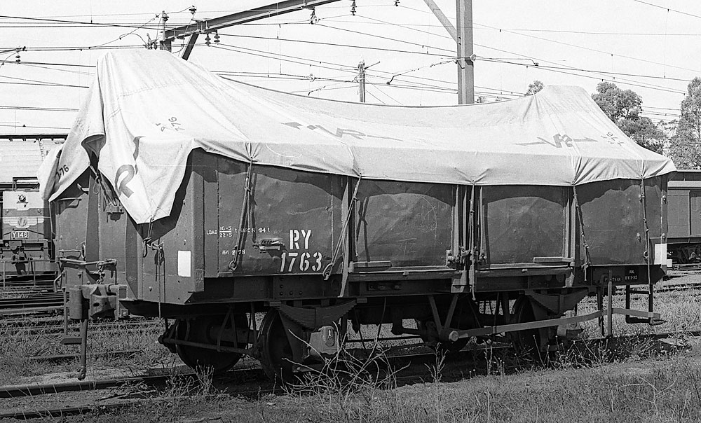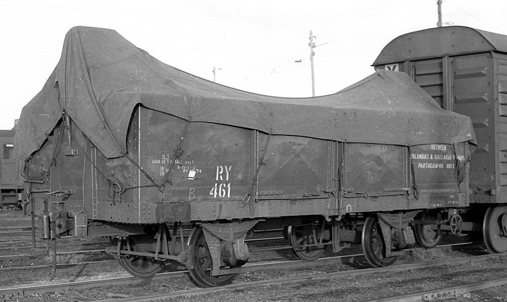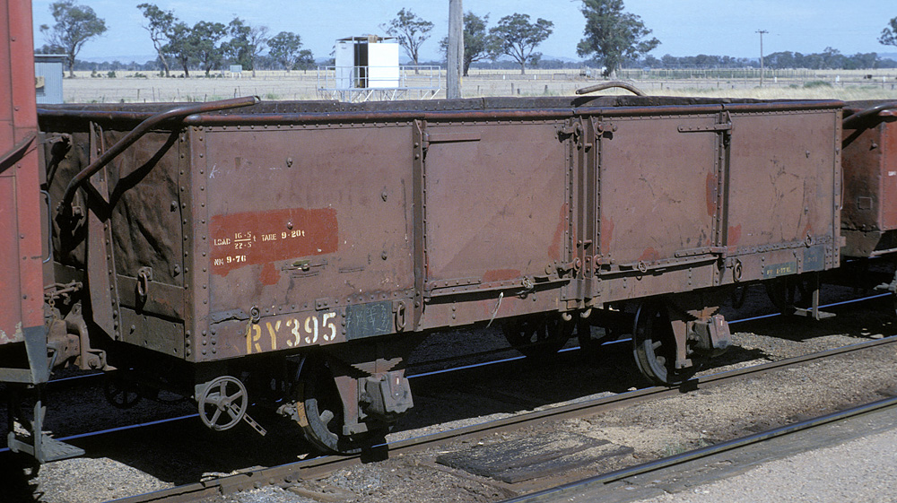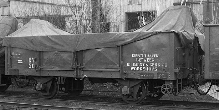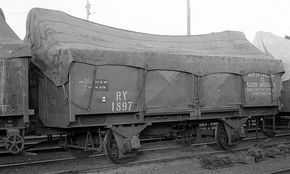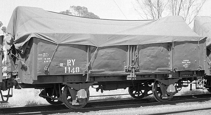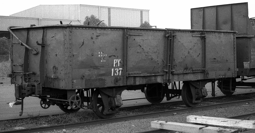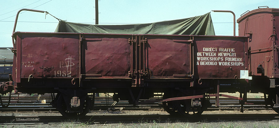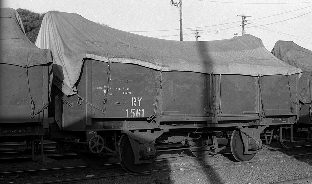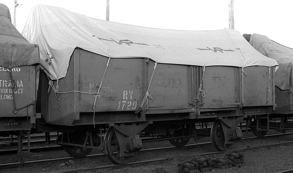RY 1977: Built as GZ 1977 at Bendigo in 1939, recoded to IZ 197 circa 1956, recoded to RY 1977 in 1965, scrapped 1980. Photo at Nth Melbourne workshops 1978. Quite a few RY's were stencilled for dedicated traffic. I don't know why the stencilled RY's were not recoded to HD like most wagons in departmental service.