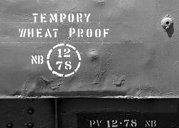 For the 1978/79 wheat harvest VR was so short of wagons that they pressed non grain wagons into wheat service. In this service the doors were given a quick fix to make them grainproof , at Portland I saw wide tape hanging from the doors as they were being unloaded. The need for wagons was so severe that the person making the stencil below didn't have time to spell "temporary" correctly!