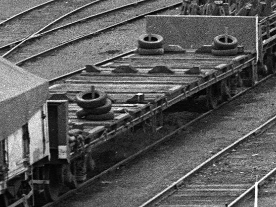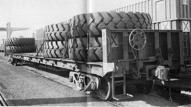| Photo below is from the June 1974 VR Newsletter Caption reads: "HEAVY MOTOR TYRES go by rail - a consignment of 2.9 metre diameter tyres after loading at the Trans-Ocean Terminal, Melbourne. The tyres, which are 0.76 metres wide, are bound for Kewdale, Western Australia, after being shipped to Melbourne. |