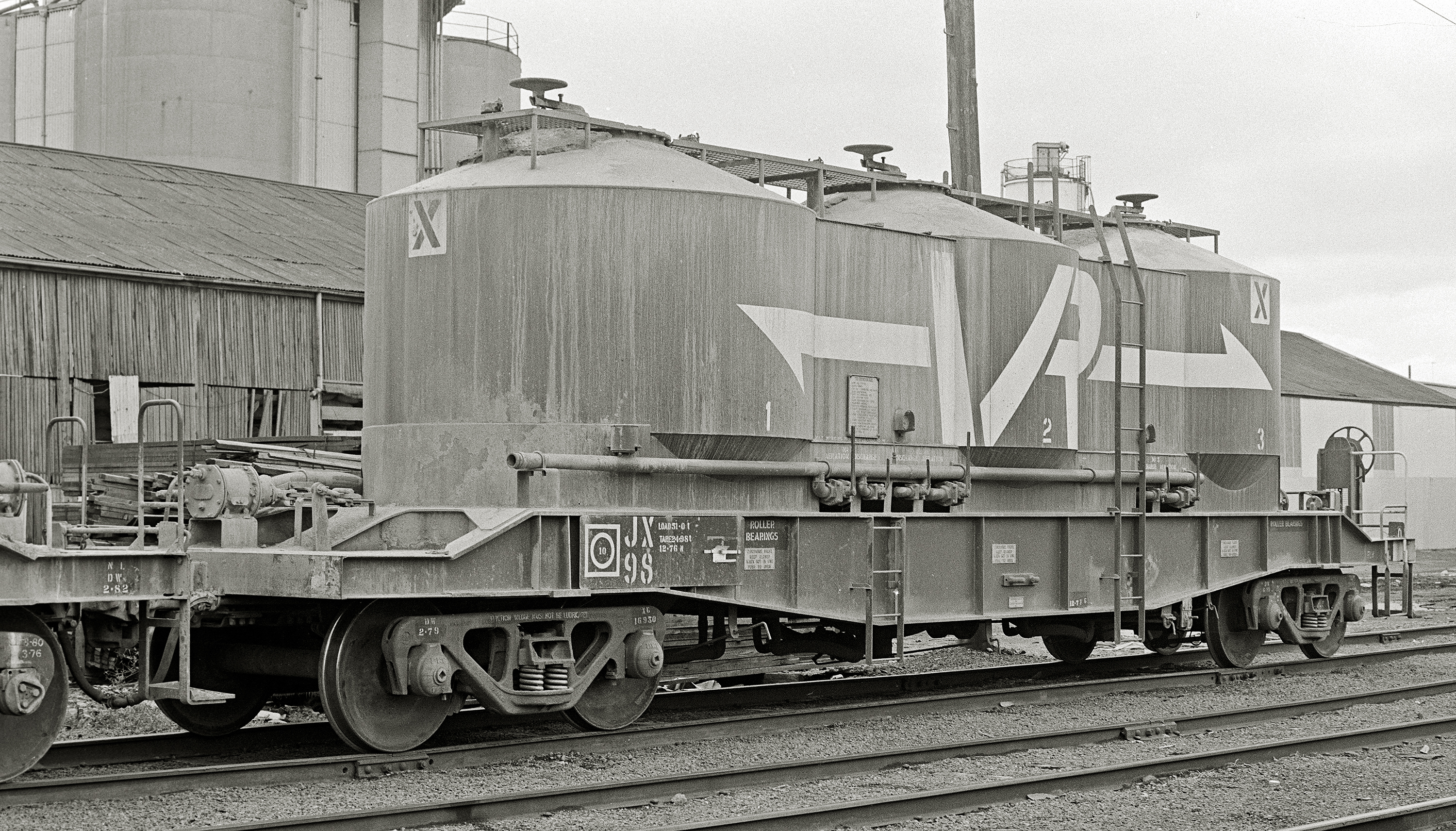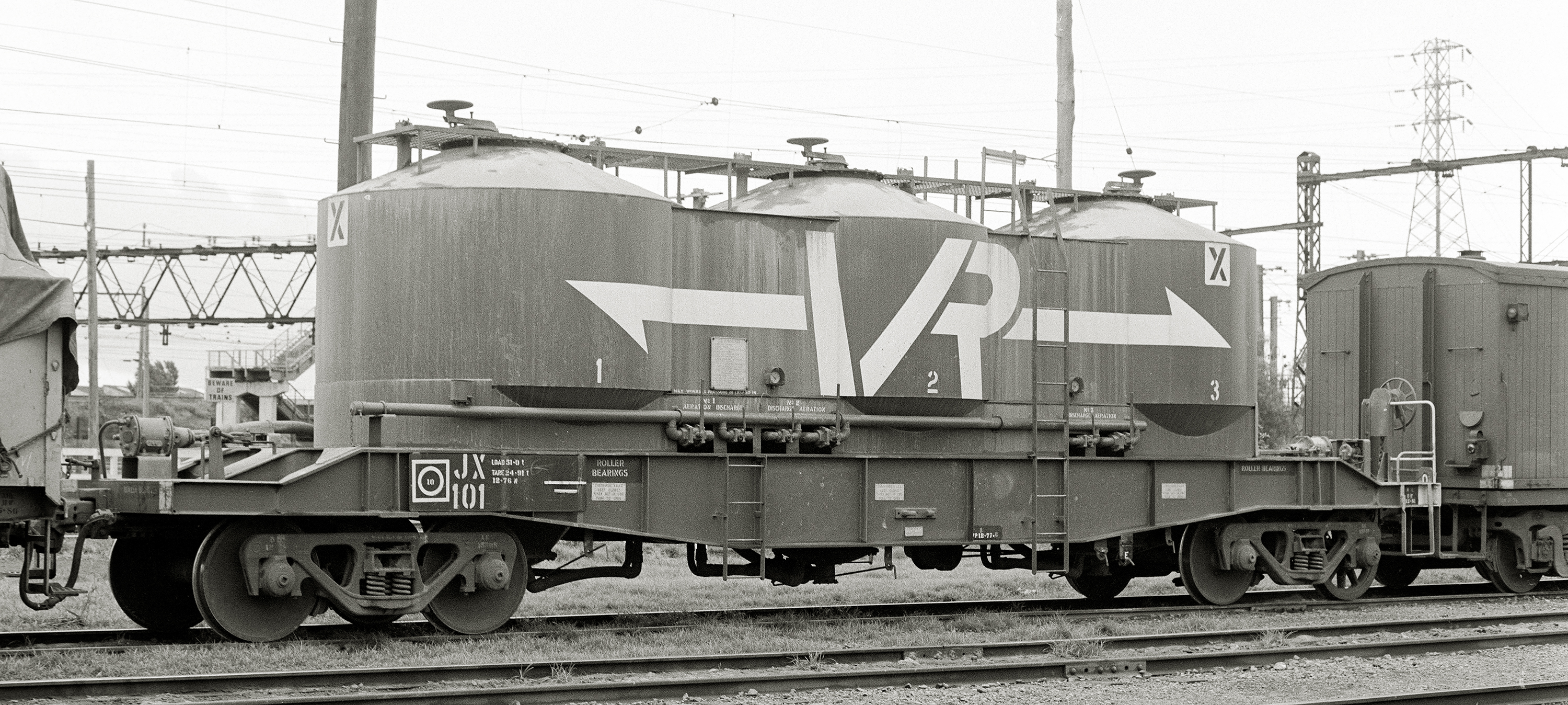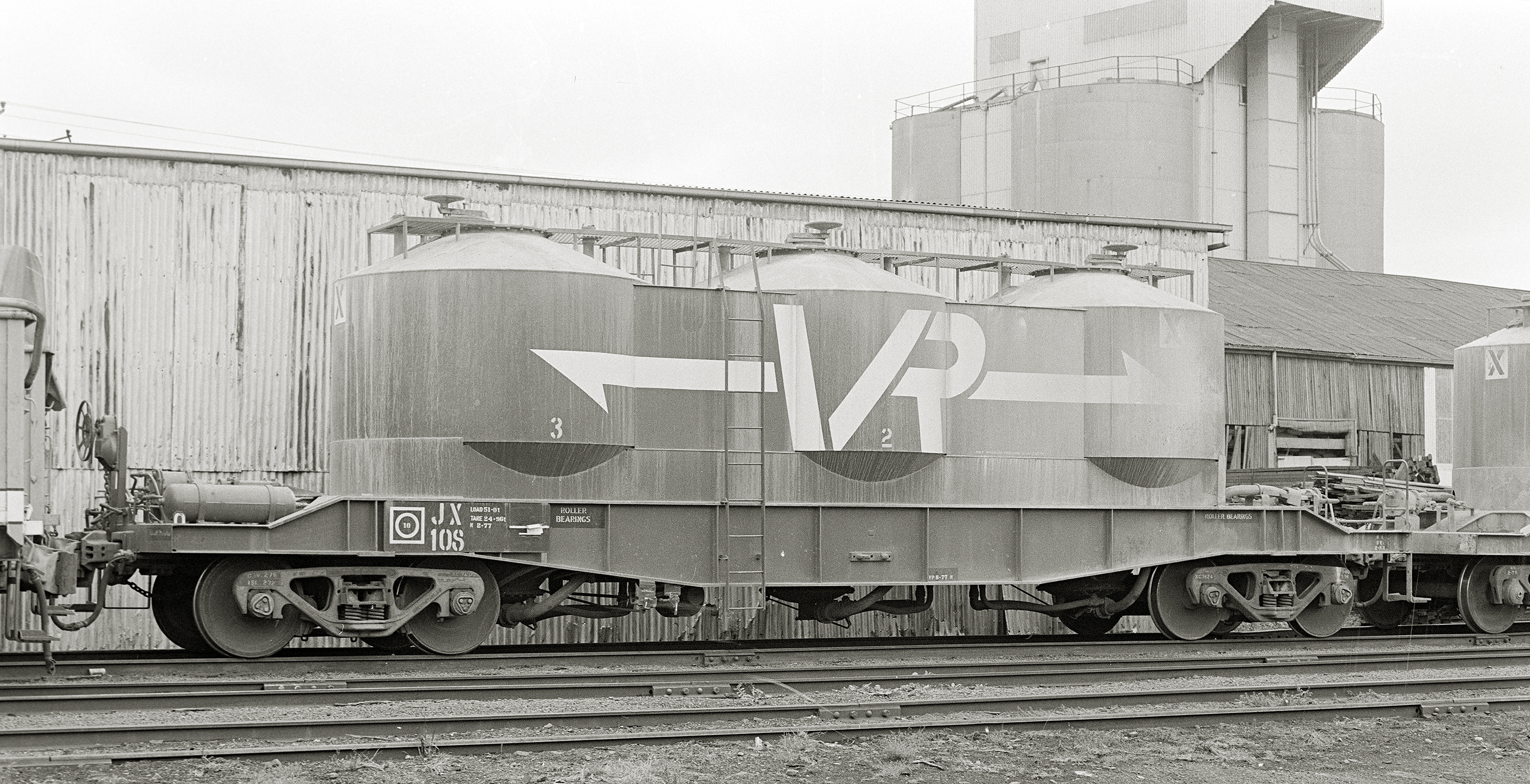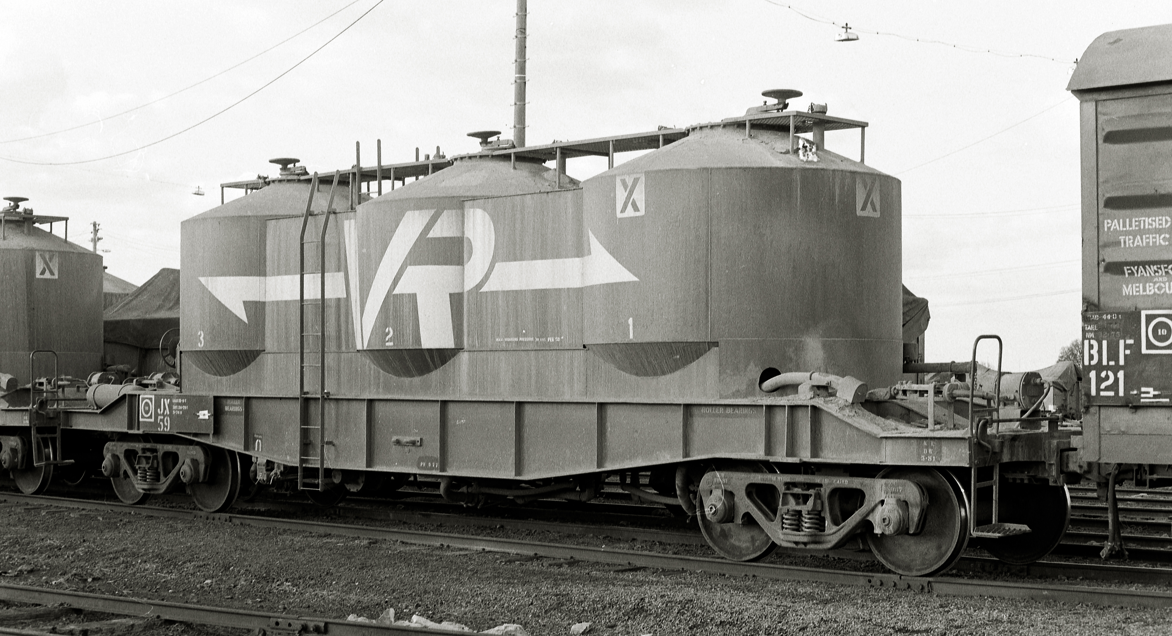 The JX's were built in 5 groups between 1963 and 1982, eventually numbering 158 wagons in the class. Theycarried bulk cement, mainly from Waurn Ponds near Geelong, to many locations around the state. An air supply was required to unload them as they were not gravity discharge. The method of discharge was the same as "Airslide" technology used in the US. In the mid 80's they were used to carry cement to NSW for the building on the new parliament house in Canberra, in this service they ran in blocks of about 15 - 30 wagons. In the 1979 recoding they became VPCX.