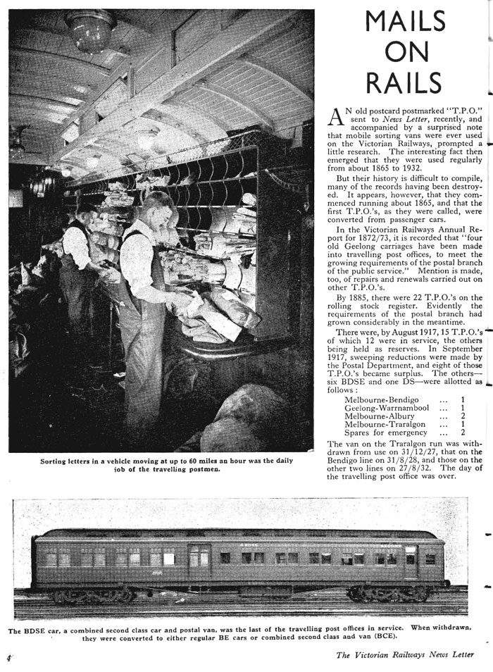 Ten combination post office and passenger cars were built 1909 - 1910. As built they were coded ESBV but very soon after they were re-coded to BDSE numbered 1 - 10. The need for travelling post offices was evidently gone by the mid 1930's. Five were converted to BE's (numbers 44 - 48) and the other five were converted to combined passenger guards vans, BCE 1 - 5. In later years they were a common sight on Geelong trains, they lasted right up until the early 80s and all five have been preserved.