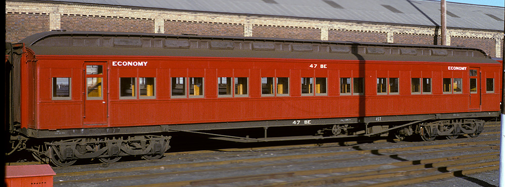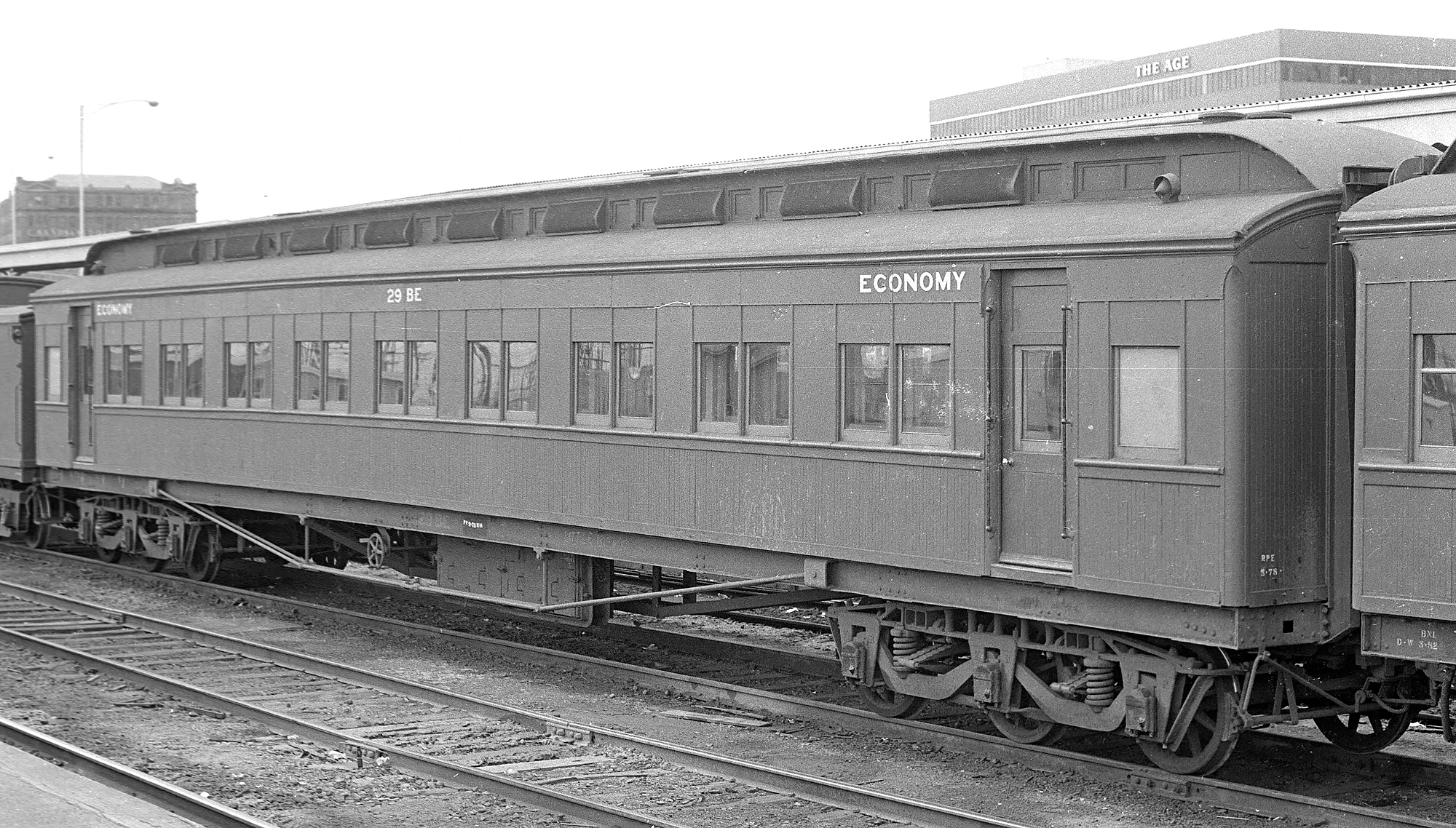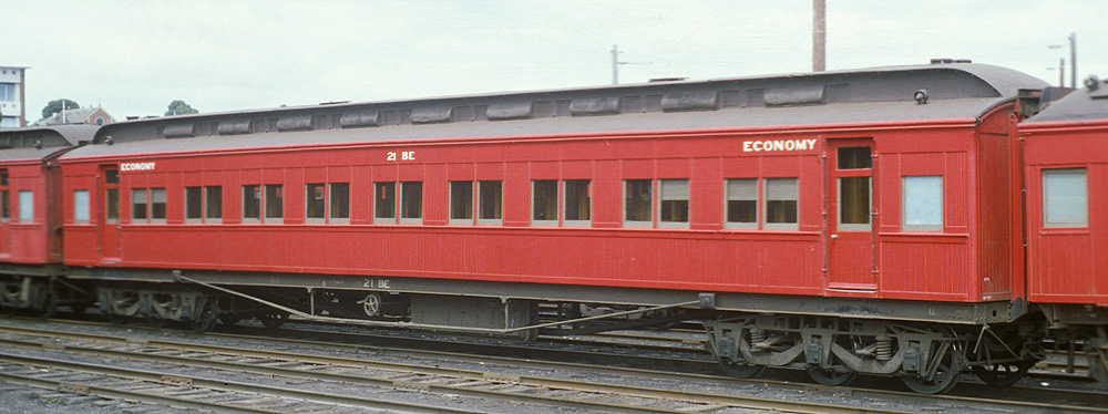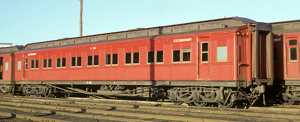 ABOVE: BE 1 at Wangaratta Sept 15 1969. The 63 year old car is so freshly painted that the smell of the new paint probably filled the air. In April 1970 the term "second class" was replaced with "economy class" which means this would probably be one of the last cars to be painted "second class", (photo courtesy Neville Gee)