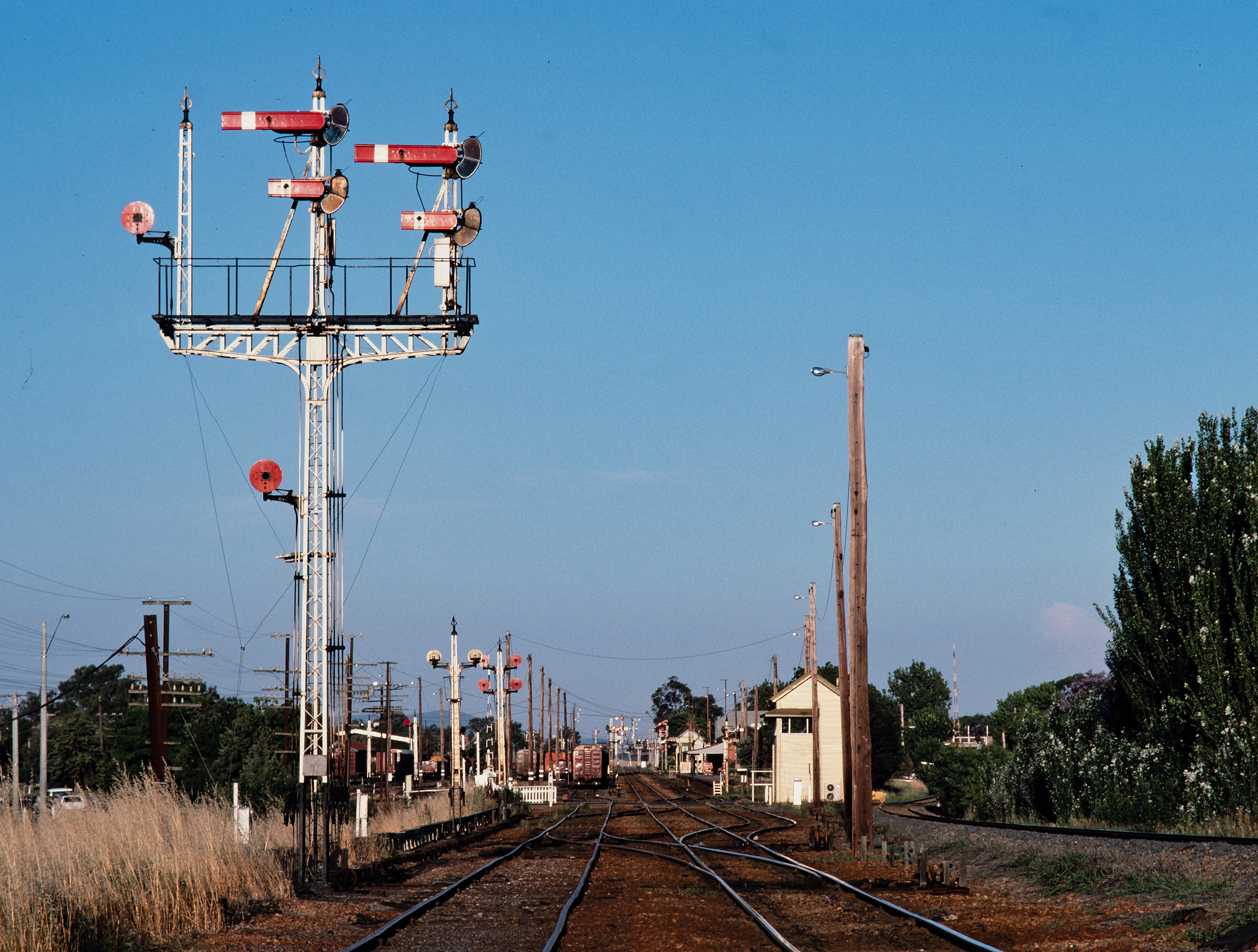 ABOVE: The impressive signal bridge at the down end of Benalla. Like most stations on the North East, the platform was on the diverging road. Trains going straight through went on No.2 road. The home signal on post 26 would be the signal the up BG Spirit of Progress got to fly through. The signalbox under the signal bridge was Benalla B, the signal box to the right was Benalla A, June 1980. (photo courtesy Dave Harvey)