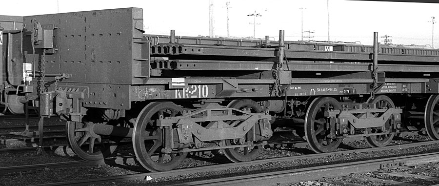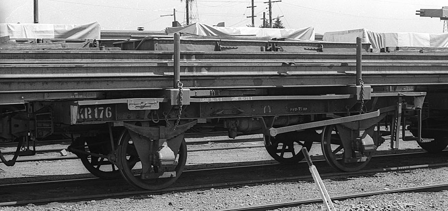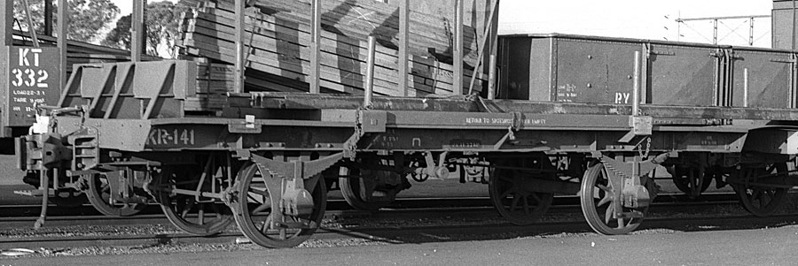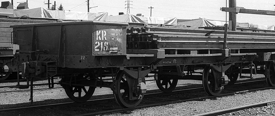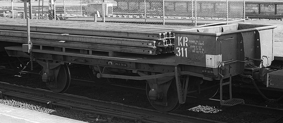 KR's were used to transport rail, at Spotswood short rail lengths from the foundry were flash butt welded into much longer lengths of continuous rail, loaded onto rakes of KR's and dispatched to the relaying project. Most KR's were 2 axle wagons built from recycled I/IA underframes, KR's 191- 210 were bogie wagons converted from steam loco tender underframes from 1960 - 1965 Each rake had a bulkhead equipped KR at each end, in between these two wagons were a number of non bulkhead KR's, (these intermediate KR's usually did not have coupler lift pins). On some rakes intermediate KR's in the rake had a crane to lift the rail up and out from the wagon and drop it onto he ground. Rakes not equipped with cranes required workmen to manually lever the rail off the wagon after the side stakes were removed. |