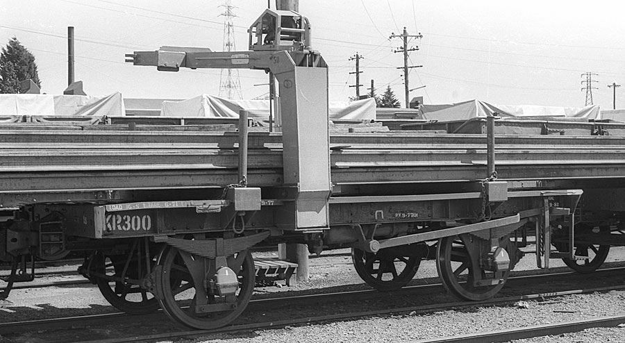 KR 300 showing the cranes used to lift the rail out of the wagon, Nth Melbourne workshops, Feb. 1978