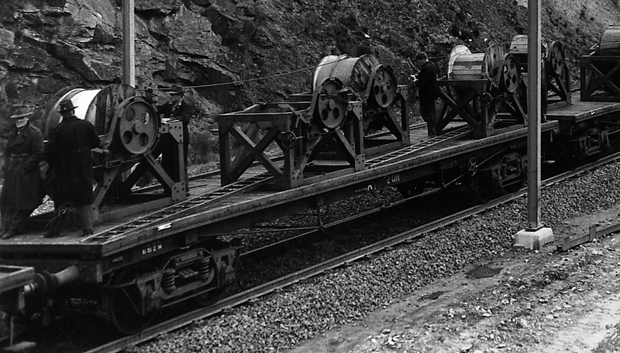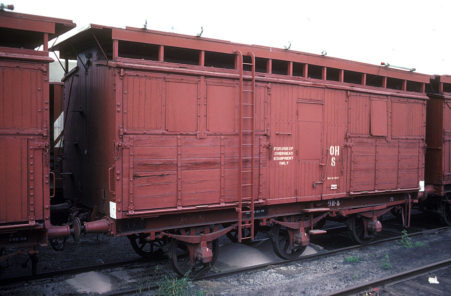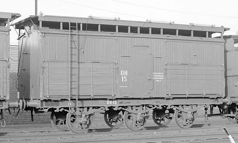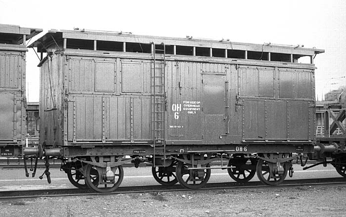 VR maintained an overhead train which was used to replace and work on the overhead wire. A group of these wagons was bracketed by two wagons carrying reels of overhead wire. The wire was attached to a stauntion and as the train pulled forward the wire would feed out and workers atop these wagons would secure the wire to the stauntions. They were converted from F horseboxes in 1951 for the Traralgon electrification project.Contact wire only needs to be replaced in 30 + year cycles so the overhead train spent long periods of inactivity stored at North Melbourne workshops.